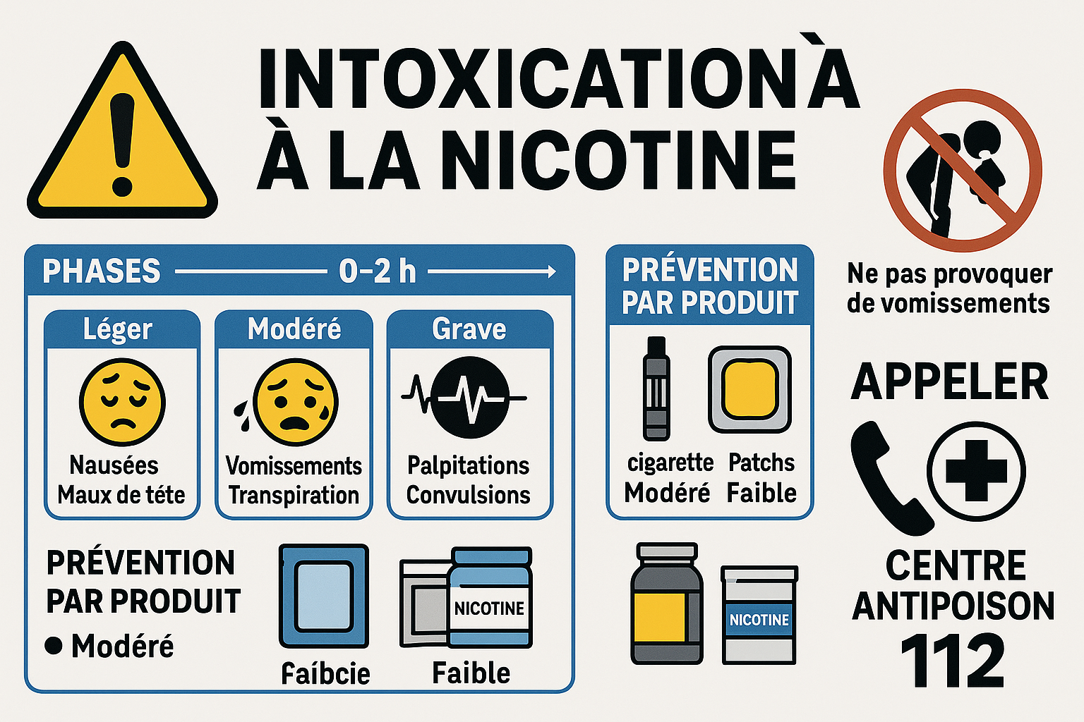 <section id="important" data-acf="important_text"> Avertissement médical : Cette information ne remplace pas une consultation médicale. Les produits nicotiniques sont réservés aux adultes et déconseillés aux femmes enceintes ou allaitantes. En cas de surdosage suspecté, contactez immédiatement un centre antipoison français (Paris 01 40 05 48 48 / Lyon 04 72 11 69 11 / Marseille 04 91 75 25 25) ou le 112. Ne jamais provoquer de vomissements. </section>